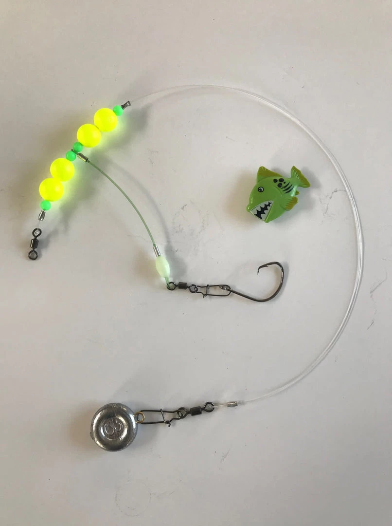 Heavy duty bass rigs with glow beads made locally in Moncton, NB.