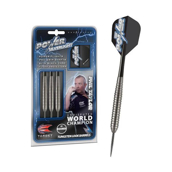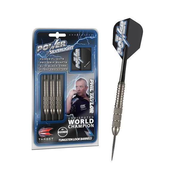 Target Phil Taylor Power Silverlight Darts are fantastic tungsten-looking brass darts that are great for beginners and developing players. Endorsed by Phil Taylor, Power Bolt comes in a range to suit most styles. Brass barrels vary by weight and may not be exactly as shown.
