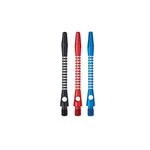 Re-Grooved aluminium shafts feature unique style ring pattern, anodised colouring, cross-hole locking device and are super slotted for easy flight fit.